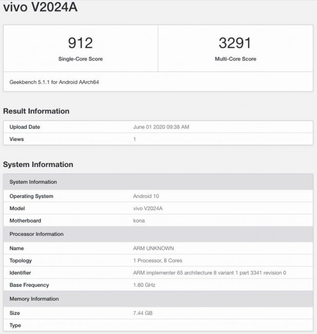В базе данных популярного теста Geekbench появилась информация о технических характеристиках нового смартфона Vivo флагманского уровня. Аппарат фигурирует под кодовым обозначением V2024A. Информация сайта - «scanpin.ru» Сообщается, что «сердце» новинки — флагманский процессор Qualcomm. Речь идёт о чипе Snapdragon 865, который содержит восемь ядер Kryo 585 с тактовой частотой до 2,84 ГГц и графический ускоритель Adreno 650. Данные Geekbench говорят о наличии в смартфоне 8 Гбайт оперативной памяти. Не исключено, что будет также выпущена модификация с 12 Гбайт ОЗУ. В качестве программной платформы значится операционная система Android 10. В одноядерном тесте аппарат показал результат в 912 баллов, в многоядерном — 3291 балл. Информации о размере и разрешении дисплея пока нет. Вероятнее всего, будет применена панель Full HD с небольшим отверстием или вырезом для фронтальной камеры. В тыльной части корпуса расположится многомодульная камера. Можно предположить, что смартфон сможет функционировать в мобильных сетях пятого поколения (5G). По оценкам Gartner, в первом квартале нынешнего года по всему миру было реализовано 299,1 млн смартфонов. В годовом исчислении поставки рухнули на 20,2 %.