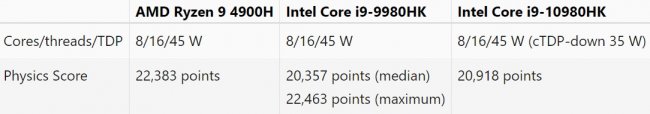 Напомним, что уровень TDP всех трёх перечисленных процессоров составляет 45 Вт. Все они восьмиядерные и поддерживают 16 виртуальных потоков. AMD Ryzen 9 4900H работает в диапазоне частот от 2,4 до 4,4 ГГц; базовая частота Intel Core i9-9980HK составляет 2,4 ГГц, при автоматическом разгоне она поднимается до 5 ГГц; свежий флагман Core i9-10980HK поколения Comet Lake работает в диапазоне 2,4–5,3 ГГц. Как можно заметить, преимущество по частоте явно за процессорами Intel. Однако в тесте 3DMark Fire Strike (Physics Score) производительность чипа AMD соответствует конкурентам.