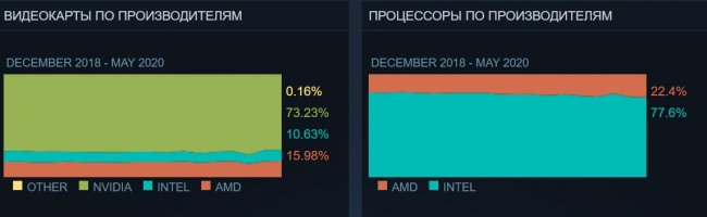 Steam опубликовал результаты мониторинга оборудования, проведённого в мае 2020 года. Компания собрала информацию об аппаратном обеспечении, используемом в компьютерах геймеров по всему миру. Согласно этим данным, AMD продолжает укреплять свои позиции на рынке процессоров. Информация сайта - «scanpin.ru» Конечно, стоит учесть, что собранная Steam статистика отображает данные только по компьютерам, на которых установлено приложение фирменного магазина компании. Однако учитывая его высокую популярность, она даёт достаточно правдоподобную картину. Судя по этой статистике, ПК-геймеры медленно, но верно переходят с процессоров Intel на решения AMD. Статистика за май показывает, что, Intel по-прежнему занимает лидирующие позиции на рынке. 77,54 % пользователей Steam используют процессоры Intel, однако их доля снизилась на 0,74 % за последний месяц в пользу компании AMD. Хотя это снижение может на первый взгляд показаться незначительным, у «синих» есть причины для беспокойства. Дело в том, что компания теряет позиции на рынке с каждым месяцем. Исключением стал лишь март. Кроме того отметим, что популярность набирают шестиядерные процессоры, доля которых по итогам мая составила 22,8 %. Самыми популярными остаются четырёхъядерные чипы, но постепенно их доля сокращается, равно как и двухъядерных. И хотя рост популярности фирменных процессоров не может не радовать AMD, на рынке видеокарт дела компании идут не так хорошо. Здесь абсолютное лидерство принадлежит NVIDIA. Девять из десяти самых часто используемых в геймерских сборках видеоускорителей принадлежат к семейству GeForce. Самой популярной среди ПК-Геймеров остается GTX 1060. Единственная видеокарта AMD, которая попала в десятку лидеров — это Radeon RX 580. Фактически, AMD занимает лишь 15,98 % рынка игровых GPU, в то время как Intel, которая создаёт только интегрированные видеочипы, используется в 10,63 % компьютеров пользователей Steam. Информация сайта - «scanpin.ru» Кроме того, майская статистика сообщает, что большинство геймеров (63,51 %) по-прежнему использует мониторы с разрешением Full HD. Следующим по популярности (10,91 %) является довольно низкое разрешение 1366 ? 768 точек, которое часто используется в бюджетных ноутбуках. И только 2,17% пользователей Steam играют на мониторах с разрешением 4К. Что касается программного обеспечения, абсолютным лидером является 64-разрядная Windows 10, которая установлена на 85,58 % компьютеров геймеров. Второй наиболее часто используемой операционной системой является Windows 7, доля которой в мае выросла на 0,61 %, несмотря на то, что Microsoft прекратила её поддержку ещё в январе.