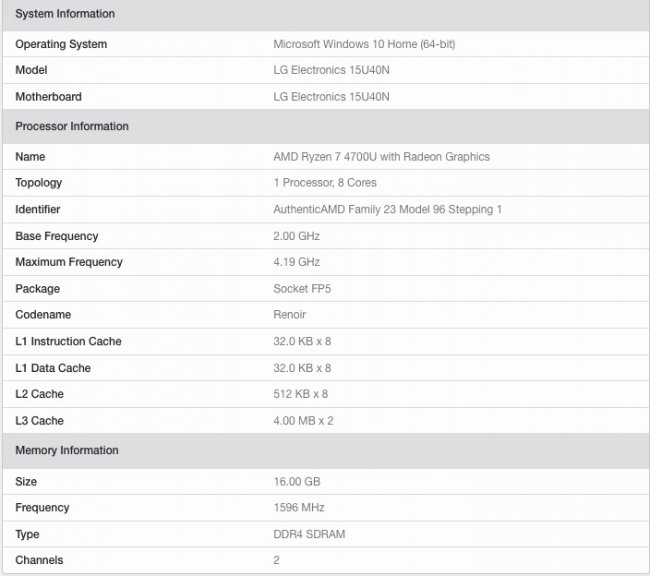 В базе данных синтетического теста Geekbench появилась информация о новом ноутбуке от южнокорейской компании LG. В качестве основы новинка с модельным номером 15U40N использует процессоры AMD Ryzen 4000 (Renoir) U-серии.