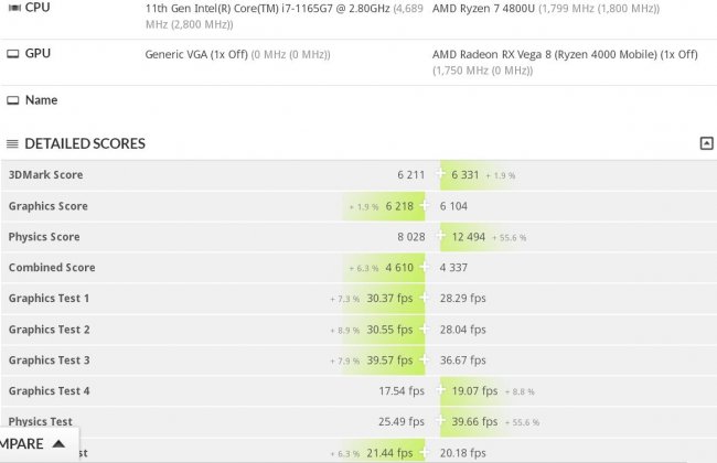 Основные баллы общего итогового результата 8-ядерный и 16-поточный Ryzen 7 4800U набрал в физическом тесте CPU. И это неудивительно, поскольку Core i7-1165G7 обладает вдвое меньшим количеством ядер и виртуальных потоков. Результат процессора AMD составил 12 494 очка, а чип Intel финишировал с результатом в 8028 баллов. Превосходство по количеству ядер и потоков также сыграло в пользу процессора AMD в четвёртом графическом тесте.