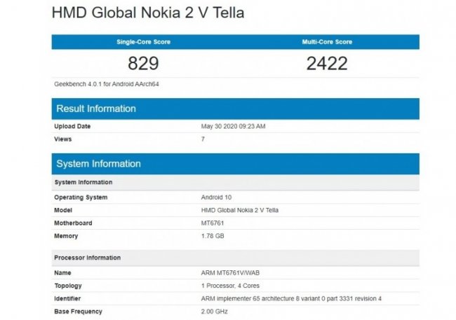 Летом 2019 года HMD Global выпустила для оператора Verizon версию смартфона Nokia 2.1, который получил имя 2 V. Устройство работало под управлением Android 9 Pie Go Edition и располагало 1 Гбайт оперативной памяти. Теперь в GeekBench был замечен смартфон под названием Nokia 2 V Tella. Вероятно, на международном рынке он выйдет под названием Nokia 2.2. Информация сайта - «scanpin.ru» Судя по представленным на сайте бенчмарка данным, новое устройство будет работать под управлением операционной системы Android 10. Его основой станет бюджетный чипсет MediaTek MT6761, известный под названием Helio A22. Кроме того, известно, что объём оперативной памяти смартфона составит 2 Гбайт, благодаря чему производитель сможет устанавливать на него полноценную версию Android, а не урезанную Go Edition. Информация сайта - «scanpin.ru» Что касается результатов тестирования, устройство совсем не впечатляет, что вполне ожидаемо. Смартфон набирает 829 баллов в одноядерном и 2422 балла в многоядерном тесте GeekBench 4.0, что примерно соответствует результатам ультрабюджетного Xiaomi Redmi 6a, который увидел свет полтора года назад и стал одним из первых смартфонов на базе MediaTek Helio A22. Больше никакой информации об устройстве, включая ориентировочную стоимость и доступность в регионах, в данный момент нет.