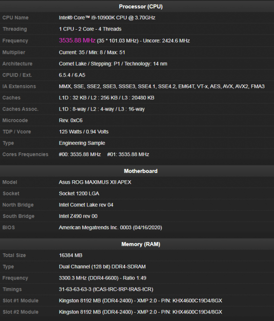 Материнская плата ASUS ROG Maximus XII Apex на основе набора логики Intel Z490 приняла не только двухканальный набор памяти, но и центральный процессор Intel Core i9-10900K семейства Comet Lake-S. Фактически, использовался инженерный образец с двумя активными ядрами и Hyper-Threading, частота которого не превышала 3536 МГц, но необходимость экстремального разгона памяти всё равно потребовала охлаждения жидким азотом.