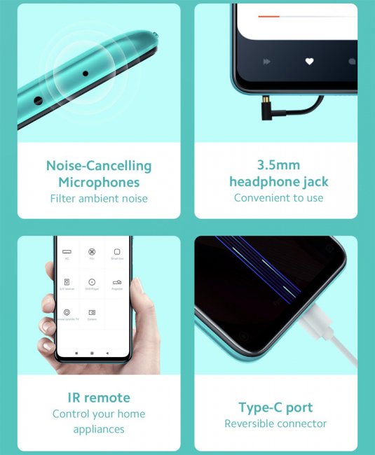 Новинка оборудована 6,53-дюймовым дисплеем формата FHD+ (2340 ? 1080 точек) с каплевидным вырезом в верхней части для одинарной фронтальной камеры. Основная камера имеет четырёхкомпонентную конфигурацию: это 13-мегапиксельный блок, 8-мегапиксельный модуль с широкоугольной оптикой, 2-мегапиксельный датчик глубины и 5-мегапиксельный макромодуль.