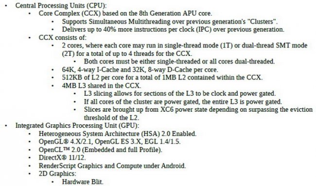 Технические характеристики графической подсистемы также не указываются. Однако сообщается, что она поддерживает API DirectX 12, OpenGL 4x/2.1, а также OpenCL 2.0. Весьма вероятно, что здесь будет применяться графика Vega первого поколения.