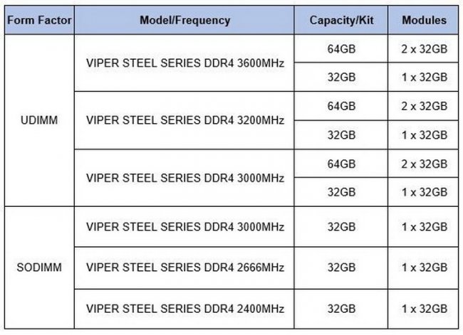 Модули памяти Viper Steel Series DDR4 Performance Memory представлены в форм-факторах SO-DIMM и UDIMM. Первые предназначены для использования в игровых ноутбуках и производительных компактных игровых станциях, а вторые — в полноразмерных игровых системах.