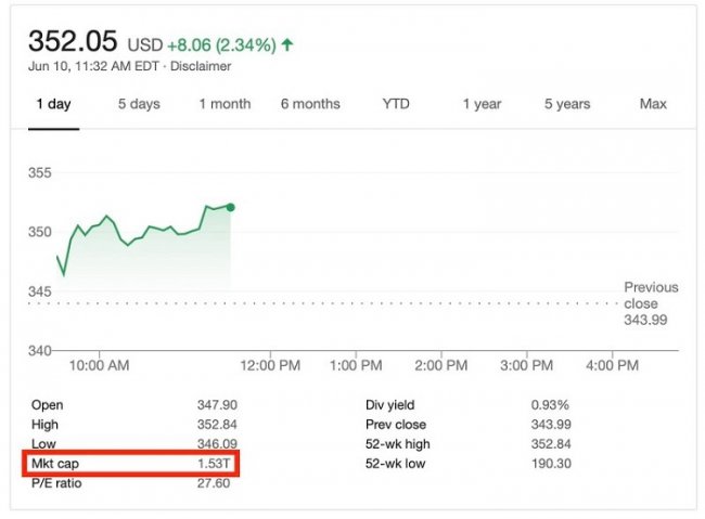 Более высокой капитализацией может похвастаться только одна компания в мире — Saudi Aramco, которая вышла на фондовую биржу только в 2019 году. Она оценивается в $1,685 триллионов. Организация зарегистрирована в Саудовской Аравии и занимается добычей нефти. Среди технологических же компаний Apple — безоговорочный лидер. При текущей цене около $352 за акцию и количестве около 4,3 миллиарда акций в обороте, рыночная капитализация Apple составляет около $1,53 триллиона.