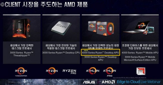 Показанная в рамках ориентированного на китайских клиентов вебинара «ASUS x AMD Edge to Cloud» презентация содержала слайд, на котором перечисляются актуальные процессоры AMD для различных рыночных сегментов. Например, для высокопроизводительных систем у AMD есть Ryzen Threadripper 3000, для более массовых настольных решений — Ryzen 3000 и Ryzen Pro 3000, для мобильного сегмента — гибридные Ryzen 3000 и 4000 Mobile.