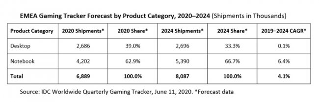 Прогноз на последующие годы оптимистичен. Ожидается, что рынок игровых компьютеров в регионе EMEA до 2024 года будет демонстрировать среднегодовой темп роста в сложных процентах (показатель CAGR) на уровне 4,1 %. В результате, в 2024-м поставки достигнут почти 8,1 млн штук. Причём две трети в этом объёме (66,7 %) составят игровые ноутбуки.