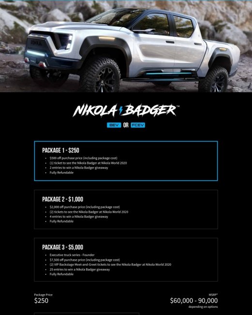 Предзаказы начнут принимать с 29 июня. Официальный аккаунт компании в Twitter сообщил, что для будет доступно три пакета предзазака пикапа Badger. При внесении суммы в размере $250 покупатель получит скидку в размере 500 долларов на покупку автомобиля, чья стоимость, в зависимости от комплектации, будет оцениваться производителем от 60 до 90 тыс. долларов США. Кроме того, в пакет предзаказа будет входить билет на мероприятие Nikola World 2020, на котором можно будет посмотреть на автомобиль лично. Оформление предзаказа также даст возможность поучаствовать в розыгрыше двух пикапов Badger — покупатель получит два купона на розыгрыш.