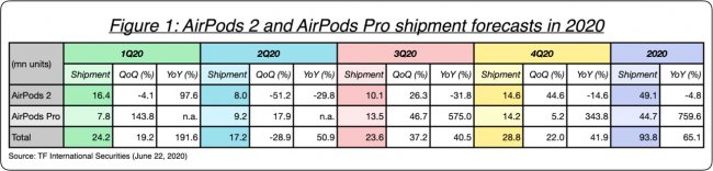 Что касается объёмов продаж, аналитик не изменяет своих прогнозов: в 2020 году общие объёмы поставок AirPods должны составить 93,8 млн единиц. Господин Куо полагает, что что наименьшие показатели будут во втором квартале 2020 года, а объёмы поставок продолжат расти в III и IV кварталах.