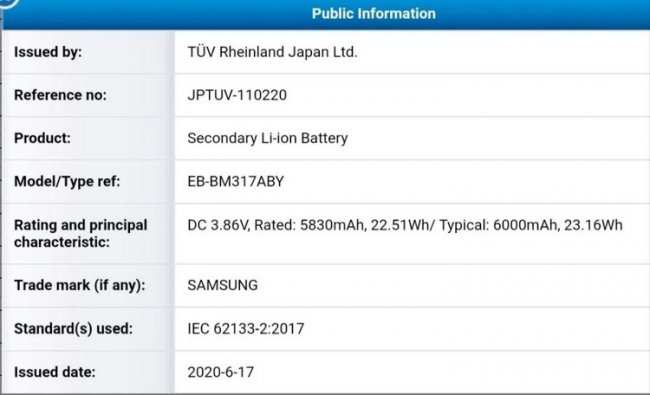Около месяца назад мы сообщали о том, что Samsung собирается выпустить новый смартфон Galaxy M31s с AMOLED-экраном и накопителем флеш-памяти объёмом 128 Гбайт. Чем ближе анонс устройства, тем больше сведений о нём стало появляться. Недавно устройство получило сертификат международного концерна T?V Rheinland. Проверке подверглась батарея новинки, подтвердив ранние слухи об её объёме. В сертификате указывается, что модельный номер батареи — EB-BM317ABY. Он частично повторяет модельный идентификатор самого смартфона — SM-M317F. Кроме того, сертификат подтверждает, что ёмкость батареи составляет 6000 мА·ч, как и у оригинальной модели. Ранее уже сообщалось, что новинка также получит поддержку быстрой зарядки мощностью 15 Вт. К сожалению, других сведений об устройстве новая утечка не содержит. Ранние слухи приписали модели Galaxy M31s наличие четырёх модулей основной камеры. При этом разрешение главного из них, как и у обычной модели Galaxy M31, представленной в феврале этого года, составит 64 Мп. Около двух недель назад устройство было замечено в базе данных Geekbench. Благодаря этому стало известно, что смартфон построен на базе восьмиядерного процессора Exynos 9611, имеет 6 Гбайт оперативной и 128 Гбайт постоянной памяти, а также находится под управлением операционной системы Android 10. Когда именно Samsung собирается представить Galaxy M31s — сказать сложно. Но основываясь на информации о запусках предыдущих моделей Galaxy M30 и Galaxy M30s можно предположить, что анонса стоит ждать в августе–сентябре. :