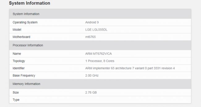 Южнокорейская компания LG, по информации сетевых источников, готовит к выпуску новый смартфон начального уровня. Сведения об аппарате обнаружены в базе популярного бенчмарка Geekbench. Информация сайта - «scanpin.ru» Устройство имеет кодовое обозначение LGL555DL. Пока не ясно, под каким именем оно дебютирует на коммерческом рынке, но тест даёт представление о возможностях модели. Известно, в частности, что основой новинке служит процессор MediaTek Helio P22. Чип содержит восемь вычислительных ядер ARM Cortex-A53 с тактовой частотой до 2,0 ГГц, графический ускоритель IMG PowerVR GE8320 и сотовый модем LTE. В составе смартфона LGL555DL процессор Helio P22 функционирует в тандеме с 3 Гбайт оперативной памяти. Известно также, что в качестве программной платформы применяется операционная система Android 9 Pie. Характеристики дисплея не раскрываются, но можно предположить, что его разрешение не превысит 720р. Параметры камер пока также держатся в секрете. Появление информации о новинке в базе Geekbench говорит о её скором официальном анонсе. Цена, вероятнее всего, не превысит 100–120 долларов США. и:
