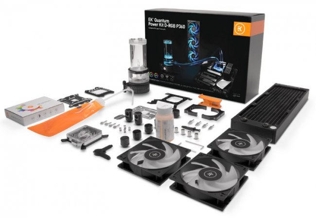 Для наиболее требовательных пользователей EK подготовила наборы EK-Quantum Power Kit. Они включают в себя всё необходимое для сборки производительной жидкостной системы охлаждения центрального процессора. Это универсальный водоблок EK-Velocity, радиатор EK-CoolStream PE типоразмера 240 или 360 мм в зависимости от модели, вентиляторы EK-Vardar, совмещённый с помпой резервуар, гибкие шланги, компрессионные фитинги, охлаждающая жидкость и другие необходимые элементы, даже с запасом.