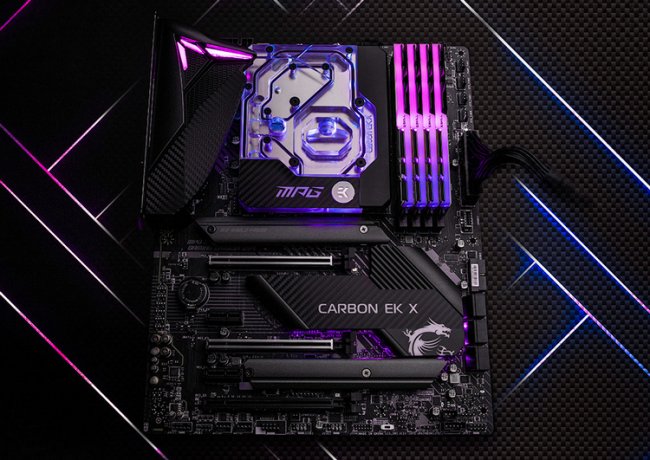 Отдельного внимания заслуживает совместный проект EK и MSI по созданию материнской платы MPG Z490 Carbon EK X для процессоров Intel Core десятого поколения. Она уникальна тем, что поставляется в комплекте с водоблоком класса «моноблок» от EK, который будет отводить тепло как от процессора, установленного в разъём LGA 1200, так и от подсистемы питания материнской платы, которая включает 12+1+1 фазу. Водоблок украшен RGB-подсветкой, а в комплекте с платой также поставляется устройство для обнаружения утечек в системе жидкостного охлаждения.
