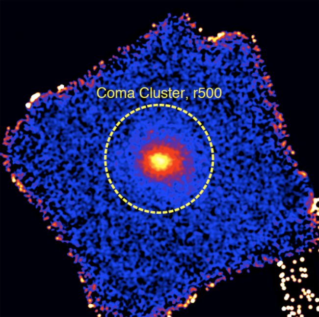 «Вместе с данными, полученными в декабре 2019 г., это позволило построить подробную карту распределения горячего газа в этом скоплении в жёстких рентгеновских лучах вплоть до радиуса R500. Это расстояние, на котором плотность материи в скоплении в 500 раз превышает среднюю плотность во Вселенной, то есть почти до теоретической границы скопления», — отмечает ИКИ РАН.