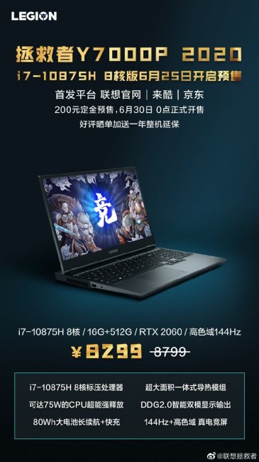 Теперь компания предлагает ноутбук Y7000P на базе восьмиядерного Core i7-10875H, с NVIDIA GeForce RTX 2060, 16 Гбайт оперативной памяти и M.2 NVMe твердотельным накопителем объёмом 512 Гбайт за 8299 юаней (около $1173). Изначальная стоимость на базе данного процессора составляла 8799 юаней (около $1245). Даже с учётом разницы в объёмах твердотельных накопителей модель ноутбука на Core i7-10875H оказалась дешевле.