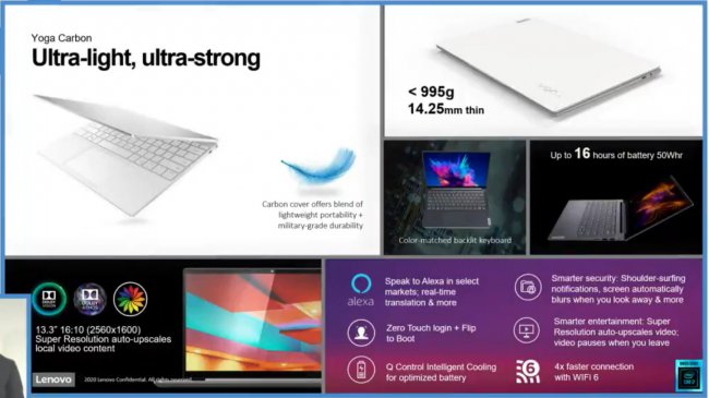 Сетевые источники сообщают о готовящемся к выпуску новом 13-дюймовом ультрабуке Lenovo Yoga Carbon серии Yoga Slim 7 на базе процессора Intel Core i7 11-го поколения Tiger Lake-U. К сожалению, конкретная модель чипа не указывается, но возможно, это Core i7-1165G7. С другой стороны, речь может идти о другом процессоре, поскольку в утечке сообщается о «более энергоэффективном чипе по сравнению со стандартной версией». В просочившемся в Сеть видео, а также в промо-материалах указываются некоторые технические характеристики будущего устройства. В частности, говорится о 13,3-дюймовом дисплее с разрешением 2560 ? 1600 точек и соотношением сторон 16:10. Также заявлен 100-процентный цветовой охват sRGB и защита от синего излучения. Помимо этого, указывается поддержка технологии Dolby Vision. (translation needed, round.2) pic.twitter.com/e2NE59SuOY — WalkingCat (@h0x0d) June 26, 2020 Мобильная рабочая станция оборудована динамиками Harman и предлагает поддержку технологии Dolby Atmos. Толщина новинки составляет всего 14,25 мм, а вес — 995 граммов. Указывается, что таких показателей удалось достичь благодаря использованию корпуса из углеродистого волокна. Батарея на 50 Вт·ч сможет обеспечить до 16 часов работы от одной подзарядки. Продлить время работы позволит технология Q Control, для которой на клавиатуре устройства выделена отдельная кнопка. После её нажатия система «сможет динамически изменять время работы от аккумулятора и контролировать температурные показатели ноутбука, в том числе за счёт эффективного управления его системой охлаждения». Новинка получит поддержку Wi-Fi 6, а также функции Zero Touch Login и Flip to Boot. О разъёмах для подключения внешних периферийных устройств, к сожалению, ничего не сообщается, но можно смело предположить наличие как минимум одного порта USB Type-C, а также комбинированного аудиоразъёма 3,5 мм. Что странно, на одном из промо-изображений показаны сразу несколько разных вариантов ультрабука — на это намекают количество и расположение разъёмов. К сожалению, никакой информации о том, когда новинка Lenovo Yoga Carbon 13 будет анонсирована, тоже не указывается. Вероятно, это случится тогда, когда Intel официально представит семейство процессоров Tiger Lake. :