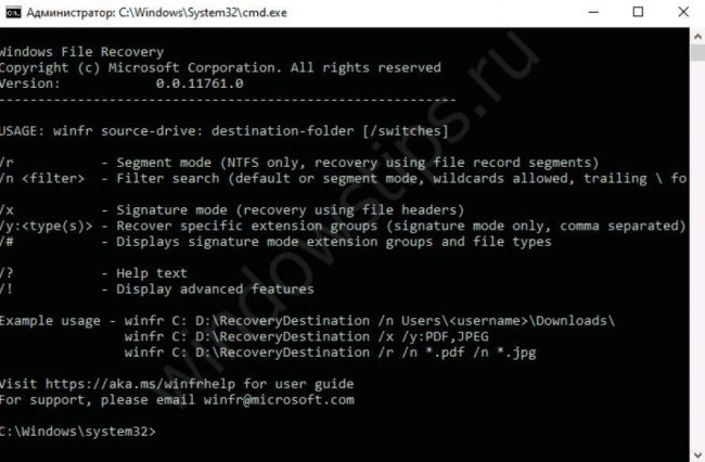 После установки программы вы увидите окно с базовой информации о пользовании утлиты. На данный момент это представлено в тексте и на английском языке. Чтобы "оживить" материалы нужно вести вот такую команду: winfr БУКВА ДИСКА: ПУТЬ К ПАПКЕ ДЛЯ ВОССТАНОВЛЕНИЯ