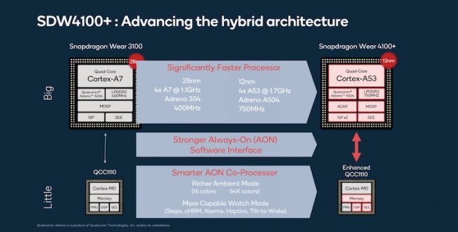Сегодня Qualcomm представила две совершенно новые платформы для смарт-часов. Чипы Snapdragon Wear 4100 и 4100 пришли на смену устаревающим 3100 и 3100 , представленным ещё в 2018 году. По словам компании, все компоненты чипсетов были существенно улучшены. Информация сайта - «scanpin.ru» В последние несколько лет умные часы, базирующиеся на чипах Qualcomm, подвергались серьёзной критике, поскольку Snapdragon Wear существенно уступали по всем параметрам решениям от Apple. Они были более горячими, менее стабильными и потребляли больше энергии. Что не странно: Snapdragon Wear 3100 и 3100 изготавливались по нормам «древнего» 28-нм техпроцесса и использовали не менее «древние» ядра Cortex-A7. Информация сайта - «scanpin.ru» Новые же чипы изготовлены по нормам 12-нм техпроцесса и включают в себя гораздо более новые ядра Cortex-A53. Хотя их тоже трудно назвать передовыми, эти характеристики существенно опережают предшествующие решения. Кроме того, частота процессора будет повышена с 1,1 до 1,7 ГГц. Чипы по-прежнему обладают четырьмя вычислительными ядрами и используют память стандарта LPDDR3. Тем не менее, её рабочая частота повысилась с 400 до 750 МГц. Информация сайта - «scanpin.ru» Также новые чипсеты получили графический процессор Adreno 504 вместо 304, что предполагает заметный скачок производительности графической подсистемы. Кроме того, в состав Snapdragon Wear 4100 и 4100 вошёл ещё один DSP, отвечающим за обработку аудио. И ещё чип теперь может обрабатывать сигнал сразу с двух камер. Информация сайта - «scanpin.ru» Что касается коммуникационных возможностей, в чипсете по-прежнему используется модем LTE Cat. 4 обеспечивающий скорость 150 Мбит/с на приём и 50 Мбит/с на передачу данных. Bluetooth-модуль теперь поддерживает стандарт 5.0. Информация сайта - «scanpin.ru» Кроме того, в часах, основанных на новых чипах, по-прежнему будет использоваться сопроцессор, помогающий разгрузить основной процессор в неинтерактивных сценариях использования. Он мало чем будет отличаться от чипа предыдущего поколения, однако сможет обеспечить отображение 16-битного цвета. Сопроцессор может служить в качестве концентратора датчиков, и собирать с них данные, пока CPU отключён. Однако производители смогут устанавливать в конечные устройства чипсет без сопроцессора, но это негативно скажется на энергопотреблении часов. Информация сайта - «scanpin.ru» Как сообщается, обновлённые платформы на 20 % энергоэффективнее и на 85 % производительнее предшественников. Новые чипсеты уже доступны и отгружаются ОЕМ-производителям. :