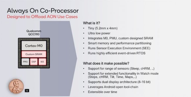 Кроме того, в часах, основанных на новых чипах, по-прежнему будет использоваться сопроцессор, помогающий разгрузить основной процессор в неинтерактивных сценариях использования. Он мало чем будет отличаться от чипа предыдущего поколения, однако сможет обеспечить отображение 16-битного цвета. Сопроцессор может служить в качестве концентратора датчиков, и собирать с них данные, пока CPU отключён. Однако производители смогут устанавливать в конечные устройства чипсет без сопроцессора, но это негативно скажется на энергопотреблении часов.