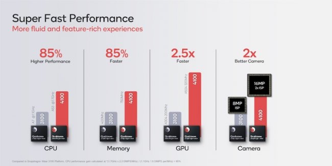 Также новые чипсеты получили графический процессор Adreno 504 вместо 304, что предполагает заметный скачок производительности графической подсистемы. Кроме того, в состав Snapdragon Wear 4100 и 4100+ вошёл ещё один DSP, отвечающим за обработку аудио. И ещё чип теперь может обрабатывать сигнал сразу с двух камер.