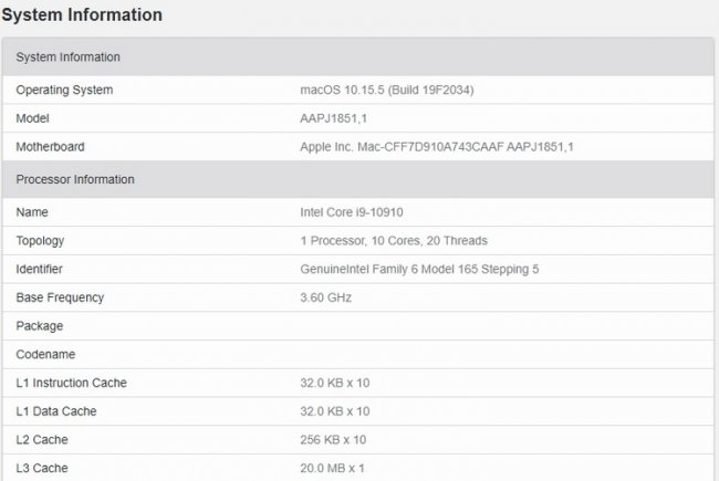 Согласно данным теста, компьютер построен на непредставленном официально процессоре Intel Core i9-10910. Он объединяет десяток ядер и работает на двадцать потоков, а его базовая частота составляет 3,6 ГГц. По всей видимости, это — особая версия чипа Core i9-10900 с увеличенной базовой частотой (с 2,8 ГГц), выпущенная специально для Apple. Компания Intel регулярно поставляет эксклюзивные версии своих процессоров специально для компьютеров Mac.