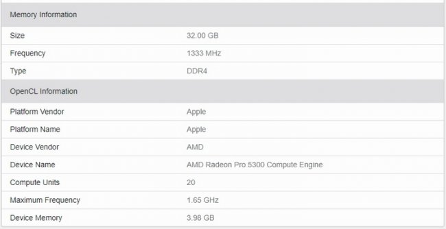 Компанию десятиядерному процессору Intel в протестированной системе составили 32 Гбайт оперативной памяти, а также дискретная видеокарта Radeon Pro 5300. Она предлагает графический процессор Navi с 20 вычислительными блоками (1280 потоковых процессоров), который работает с частотой до 1650 МГц. Объём видеопамяти равен 4 Гбайт.