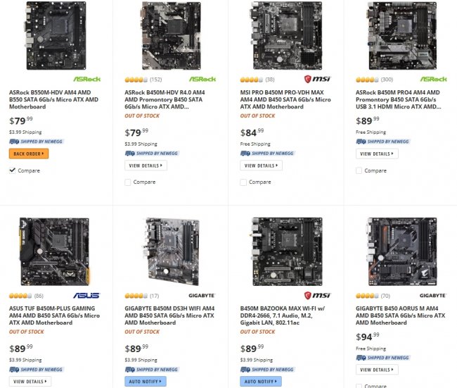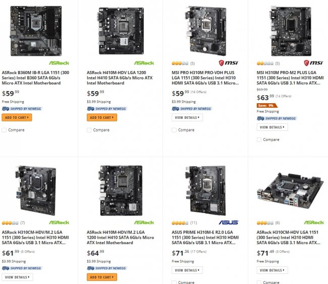 Наиболее доступные материнские платы типоразмера Micro-ATX с процессорным разъёмом Intel LGA 1200 и LGA 1151v2 стоят $60, тогда как самая дешёвая материнская плата аналогичного формата на базе AMD B350 обойдётся в $70. Но что характерно, материнские платы Micro-ATX на базе более свежих чипсетов AMD B450 и B550, которые гарантированно смогут работать с будущими процессорами, стоят уже от $80. Также стоит отметить, что для процессоров Intel в целом предлагается более широкий выбор доступных моделей, чем для AMD.