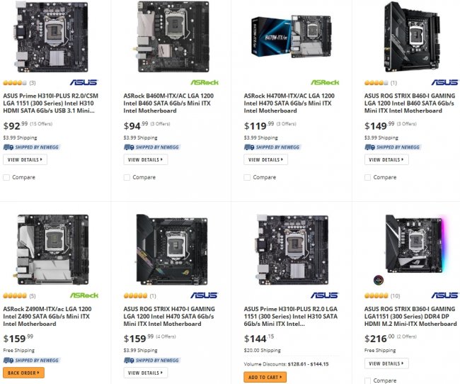 Среди наиболее компактных плат, выполненных в форм-факторе Mini-ITX, разница между платформами Intel и AMD оказывается ещё больше. Самая дешёвая из доступных для покупки на данный момент плат такого форм-фактора с разъёмом LGA 1151v2 стоит $144 и построена она на чипсете Intel H310. Более современный разъём LGA 1200 в плате формата Mini-ITX можно получить за $160, и это уже будет изделие на Intel Z490. Заметим, что также магазин упоминает платы Mini-ITX для последних поколений процессоров Intel по цене от $90, но в наличии их сейчас нет.