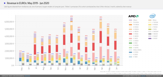 Процессоры Intel Comet Lake-S в исполнении LGA 1200 поступили в продажу в конце мая, местами наблюдался дефицит некоторых моделей, поэтому судить о первом полном месяце продаж можно было только по итогам июня. Статистика немецкого интернет-магазина MindFactory показала, что позиции AMD дебют новых процессоров конкурента почти не пошатнул.