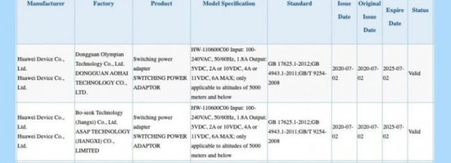 Благодаря информации, размещённой на сайте китайского регулятора 3С, стало известно, что Huawei подала заявку на сертификацию 66-Вт блока питания для мобильных устройств. Он, по некоторым данным, будет поставляться в комплекте с грядущим флагманским смартфоном Mate 40, выпуск которого ожидается этой осенью.