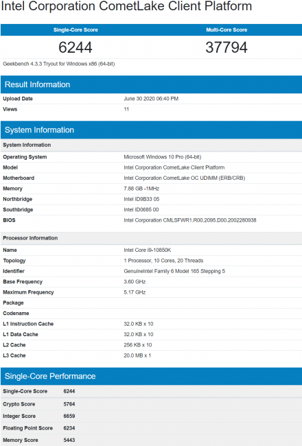 В базе данных синтетического теста Geekbench 4 был замечен 10-ядерный процессор Intel Core i9-10850K серии Comet Lake-S. Как указывают сетевые источники, данный чип может оказаться более выгодной с финансовой точки зрения альтернативой флагманской модели Core i9-10900K.