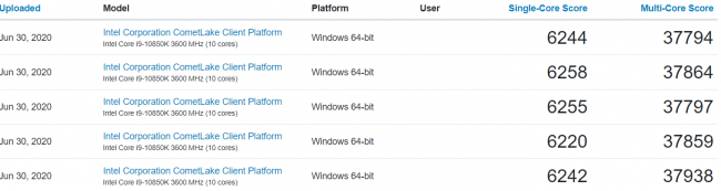 Базовая и максимальная частота нового процессора на 100 МГц ниже, чем заявлены для старшего Core i9-10900K (3,7/5,3 ГГц). Исходя из имеющихся результатов, производительность Core i9-10850K в однопоточном испытании Geekbench 4 практически такая же, как и у флагмана, а в многопоточных задачах он в среднем на 5 % медленнее старшего собрата — 38 000 очков против около 40 000 соответственно.