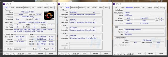 Приведённый скриншот CPU-Z показывает, что Ryzen 7 4700G основан на 7-нм архитектуре Zen 2. Он включает 8 ядер и 16 потоков, 4 Мбайт кеш-памяти L2 и 8 Мбайт кеша L3, что в сумме составляет 12 Мбайт. Это, безусловно, заметно меньше, чем 32 Мбайт кеша L3, которым располагает 8-ядерный Ryzen 7 3800X, но это связано с монолитным характером чипа, который использует один кристалл, а не несколько чиплетов под одной упаковкой, как серия Ryzen 3000 Matisse.