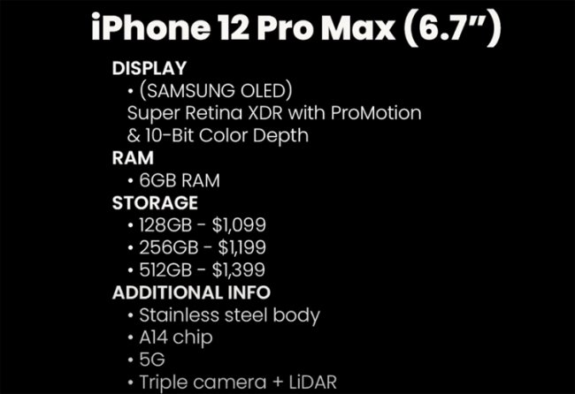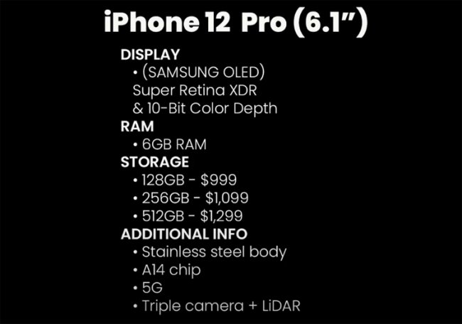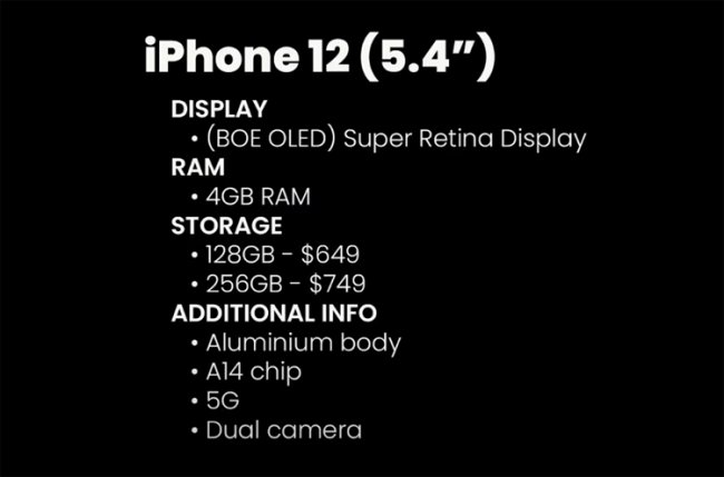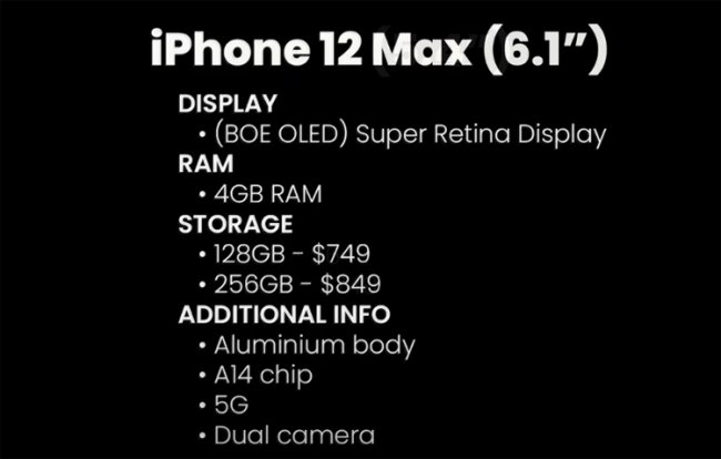 В новом семействе смартфонов Apple ожидается анонс четырёх моделей: iPhone 12 (5,4 дюйма), iPhone 12 Max (6,1 дюйма), iPhone 12 Pro (6,1 дюйма) и iPhone 12 Pro Max (6,7 дюйма). Первые две, по слухам, получат 4 Гбайт оперативной памяти и флеш-накопитель вместимостью 128 или 256 Гбайт. Модели с приставкой Pro будут нести на борту 6 Гбайт ОЗУ и накопитель ёмкостью 128, 256 и 512 Гбайт.