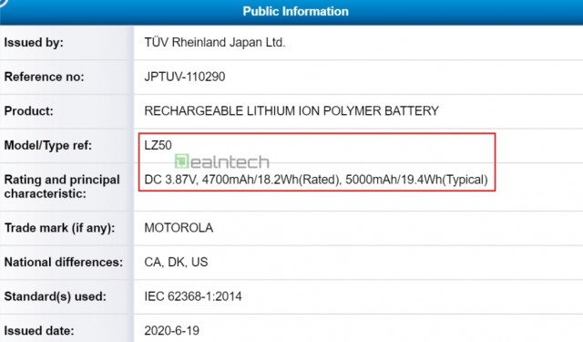 Также упоминание устройства было обнаружено на сайте организации TUV Rheinland. В опубликованных данных сообщается, что смартфон оснащён батареей ёмкостью 5000 мА·ч, а также имеет поддержку быстрой зарядки мощностью 20 Вт.