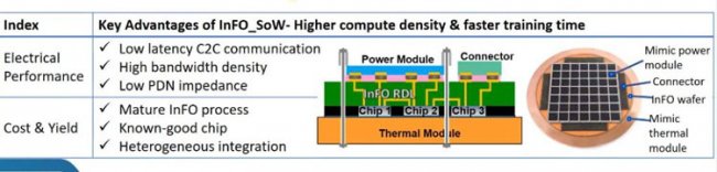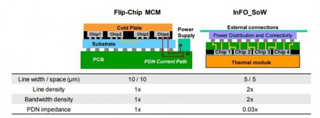 Упаковка InFO SoW является следствием развития техпроцесса упаковок Integrated Fan-Out и InFO-WLP (wafer-level processing). В первом случае отдельные кристаллы вырезаются из пластины и пакуются отдельно, что даёт простор для выходных (посадочных) контактов, но ведёт к увеличению размеров чипа (упаковки). Во втором случае часть операций по упаковке проводятся до разрезания пластины на кристаллы, что делает чипы меньше, включая упаковку, но ограничивает число посадочных контактов. Техпроцесс InFO SoW совмещает оба метода, позволяя обрабатывать пластину целиком и ни в чём не ограничивать суперпроцессор.