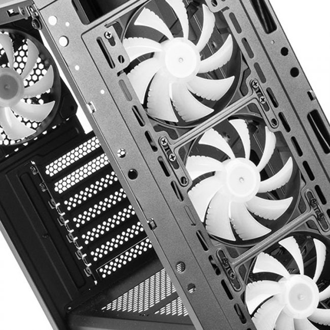 За сетчатой фронтальной панелью с основой в виде пчелиных сот скрываются три 120-мм вентилятора с многоцветной подсветкой. Ещё один такой же кулер установлен в тыльной части. Любоваться внутренней компоновкой можно через боковую стенку, изготовленную из закалённого стекла.