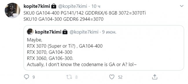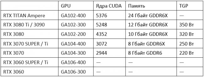 В свою очередь графический процессор GA104 в полноценной версии со всеми 3072 активными ядрами CUDA (GA104-400), согласно последним данным, получит видеокарта GeForce RTX 3070 Ti (или Super). Стоящая на ступень ниже GeForce RTX 3070 получит несколько урезанную версию данного GPU — GA104-300 с 2944 ядрами CUDA. Ещё сообщается, что эти видеокарты будут обладать весьма внушительным энергопотреблением: 250 Вт — у GeForce RTX 3070 Ti и 220 Вт — у GeForce RTX 3070.