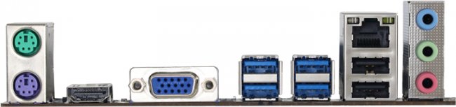Интерфейсная панель содержит гнёзда PS/2 для клавиатуры и мыши, разъёмы HDMI и D-Sub для вывода изображения, четыре порта USB 3.2 Gen1 и два порта USB 2.0, гнездо для сетевого кабеля и набор аудиогнёзд.