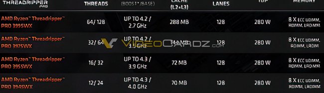 Возглавит серию процессор Ryzen Threadripper PRO 3995WX. Она сможет предложить 64 ядра и 128 виртуальных потоков. Рабочий диапазон частот новинки составит 2,7–4,2 ГГц. Общий объём кеш-памяти L2+L3 составит 288 Мбайт. Следом идёт Ryzen Threadripper PRO 3975WX с 32 ядрами и 64 потоками. Базовая частота процессора составит 3,5 ГГц. В режиме автоматического разгона она сможет повышаться до 4,2 ГГц. Общий заявленный объем кеш-памяти у модели составляет 144 Мбайт.
