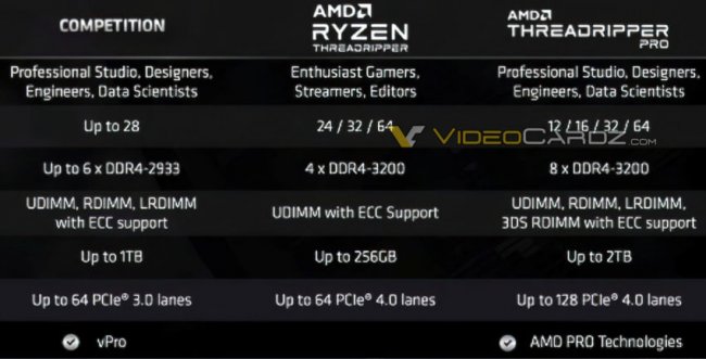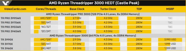 В отличии от недавно обновлённых чипов Ryzen 3000XT, в которых AMD ограничилась лишь прибавкой 100–200 МГц к пиковой частоте, новые высокопроизводительные процессоры Ryzen Threadripper PRO, рассчитанные на профессиональных пользователей, будут гораздо интереснее. Если вкратце, то конфигурация ядер и потоков останется прежней, частоты у них наоборот станут ниже, но прибавится каналов памяти.