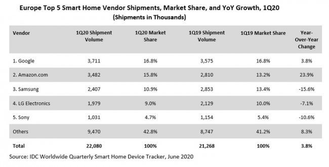 Лидером рынка устройств для смарт-жилища в Европе по итогам первого квартала 2020-го стала компания Google с долей в 16,8 %. Далее идёт Amazon с 15,8 %, а замыкает тройку Samsung — 10,9 %.