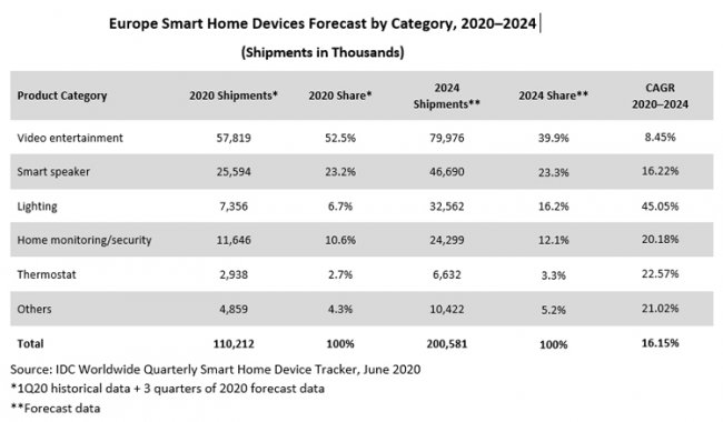 Исследование, проведённое компанией International Data Corporation (IDC), говорит о том, что европейский рынок устройств для современного «умного» дома в первой четверти текущего года показал рост на 3,8 % по сравнению с тем же периодом 2019-го. Объём отрасли составил около 22,08 млн штук. Эти данные учитывают отгрузки таких продуктов, как телевизионные приставки, системы мониторинга и обеспечения безопасности, интеллектуальные осветительные приборы, «умные» динамики, термостаты и пр. Лидером рынка устройств для смарт-жилища в Европе по итогам первого квартала 2020-го стала компания Google с долей в 16,8 %. Далее идёт Amazon с 15,8 %, а замыкает тройку Samsung — 10,9 %. Аналитики отмечают, что распространение коронавируса замедлило развитие европейского рынка устройств для «умного» дома. До начала пандемии здесь фиксировался рост на двузначные числа процентов. Впрочем, в дальнейшем ситуация должна улучшиться. IDC полагает, что в период с 2020 по 2024 год показатель CAGR (среднегодовой темп роста в сложных процентах) составит 16,15 %. В результате, в 2024 году в Европе будет реализовано свыше 200 млн устройств для смарт-жилища против примерно 110 млн, которые прогнозируются по итогам нынешнего года. :