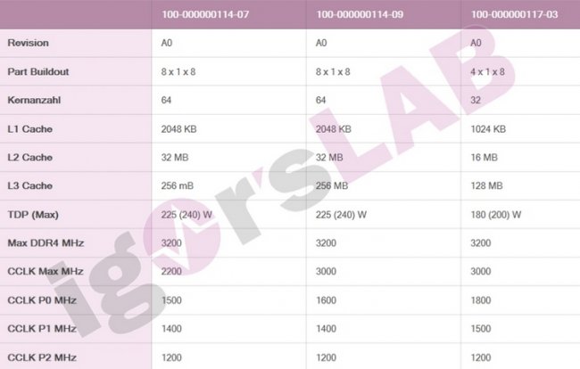 Но наибольший интерес вызывает не организация кеш-памяти, а тактовые частоты процессоров. У одного из 64-ядерных образцов максимальная Boost-частота составляет всего 2,2 ГГц, тогда как у другого, равно как и у 32-ядерного чипа, она равна 3,0 ГГц. Для инженерных образцов это весьма внушительно. Особенно если учесть, что у серийных EPYC Rome максимальная Boost-частота достигает 3,4 ГГц. Это даёт надежду, что в конечном итоге процессоры EPYC Milan смогут предложить довольно заметный прирост тактовой частоты по сравнению с нынешними серверными процессорами AMD.