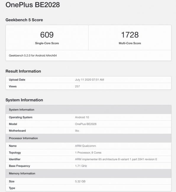 Ещё один готовящийся смартфон OnePlus фигурирует под кодовым обозначением BE2028. Информация о некоторых технических характеристиках устройства появилась в базе популярного бенчмарка Geekbench.