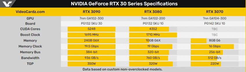 Флагман NVIDIA GeForce RTX 3090 якобы использует чип GA102-300 с 5248 ядрами CUDA и оборудована 24 Гбайт GDDR6X с шиной 384 бит и производительностью 19,5 Гбит/с на контакт. Благодаря этому теоретическая пропускная способность составит 936 Гбайт/с. Заявленный уровень TGP (Total Graphics Power — полное энергопотребление видеокарты) для этой модели будет составлять 350 Вт. Стандартный дизайн платы от NVIDIA будет включать новый 12-контактный разъём внешнего питания.