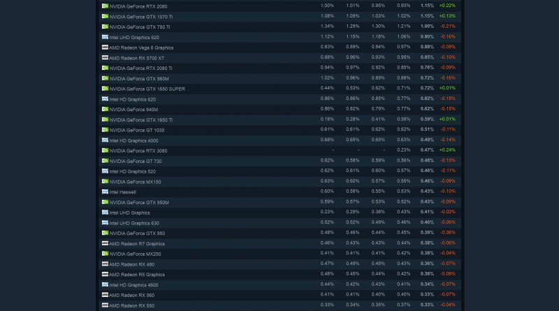 Это уже делает GeForce RTX 3080 более распространённой, чем GeForce GTX 980 от той же NVIDIA (ею пользуется 0,3 % опрошенных). Удивительно, но GeForce RTX 3080 также является единственным графическим ускорителем последнего поколения, появившимся в списке. Три других GeForce RTX 30-й серии вообще там отсутствуют, как и новейшие карты AMD Radeon 6000. Это говорит о том, что количество последних ниже порога, необходимого для включения в статистику.