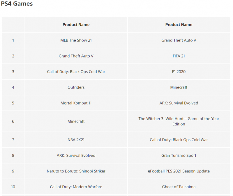 На PS4 лидерами стали MLB The Show 21 и Grand Theft Auto V. Последняя заняла второе место в США и Канаде, а в Европе условное «серебро» досталось FIFA 21. Замыкают первую тройку Call of Duty: Black Ops Cold War и F1 2020 соответственно.